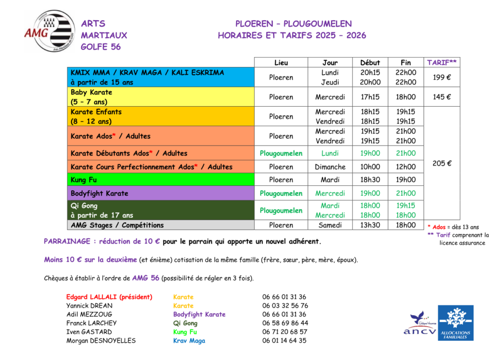 - Passer nous voir aux dojos lors des cours à PLOEREN ( le RAQUER ) et à PLOUGOUMELEN ( salle multisport )